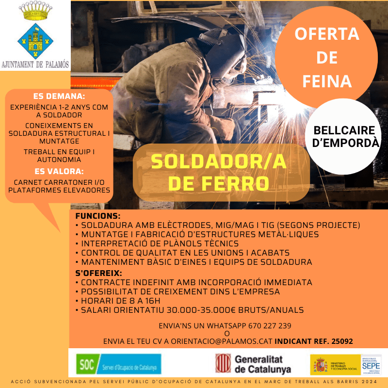 Empresa especialitzada en estructures metàl·liques cerca incorporar un/a Soldador/a de ferro amb experiència demostrable en les funcions pròpies del lloc.