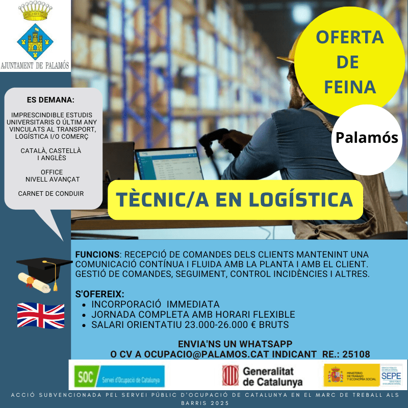 Es cerca una persona amb estudis universitaris o darrer curs i bon nivell d'anglès per treballar en empresa com a tècnic/a de logística.