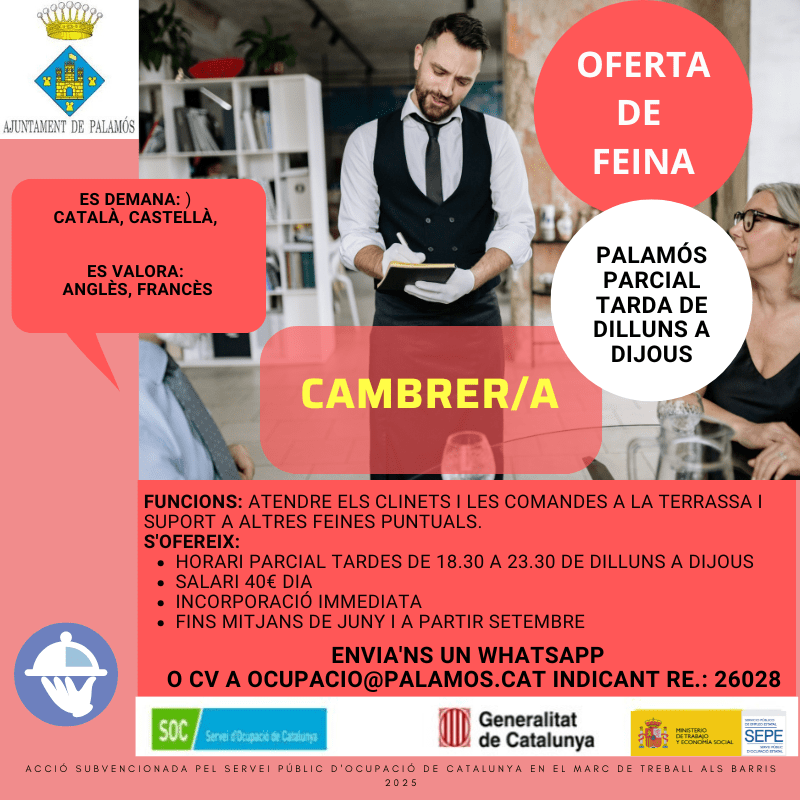 Es cerca cambrer/a per tardes de 18.30 a 23.30 H de dilluns a dijous. Incorporació immediata.