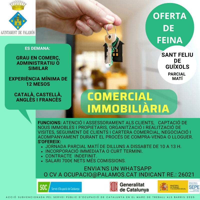 Es cerca comercial per immobiliària a Sant Feliu de Guíxols. Jornada parcial matí de dilluns a dissabte.