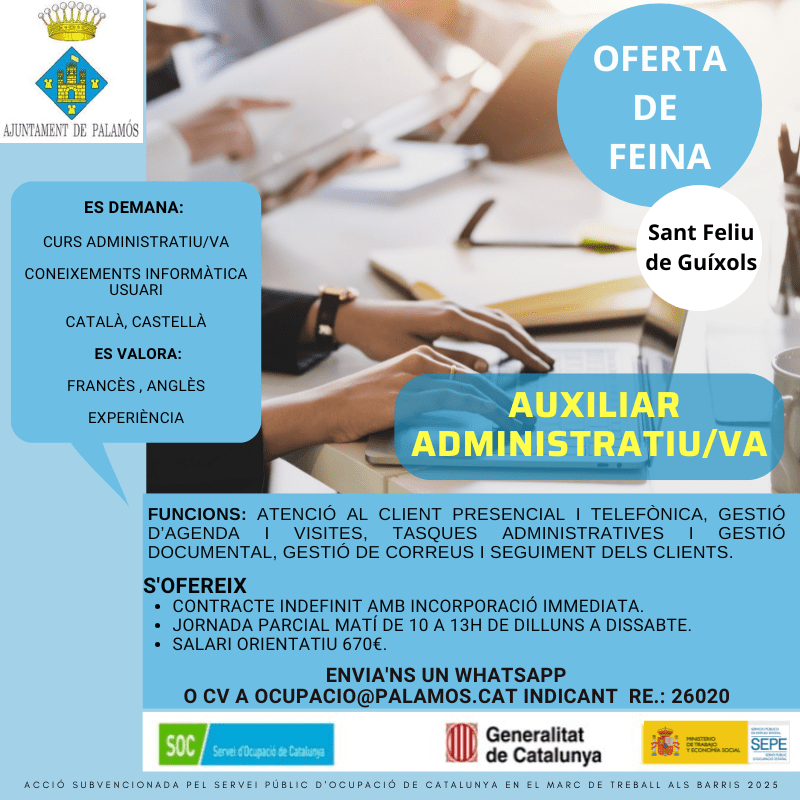 Es cerca auxiliar administratiu/va per immobiliària a Sant Feliu de Guíxols. Jornada parcial matí de dilluns a dissabte.