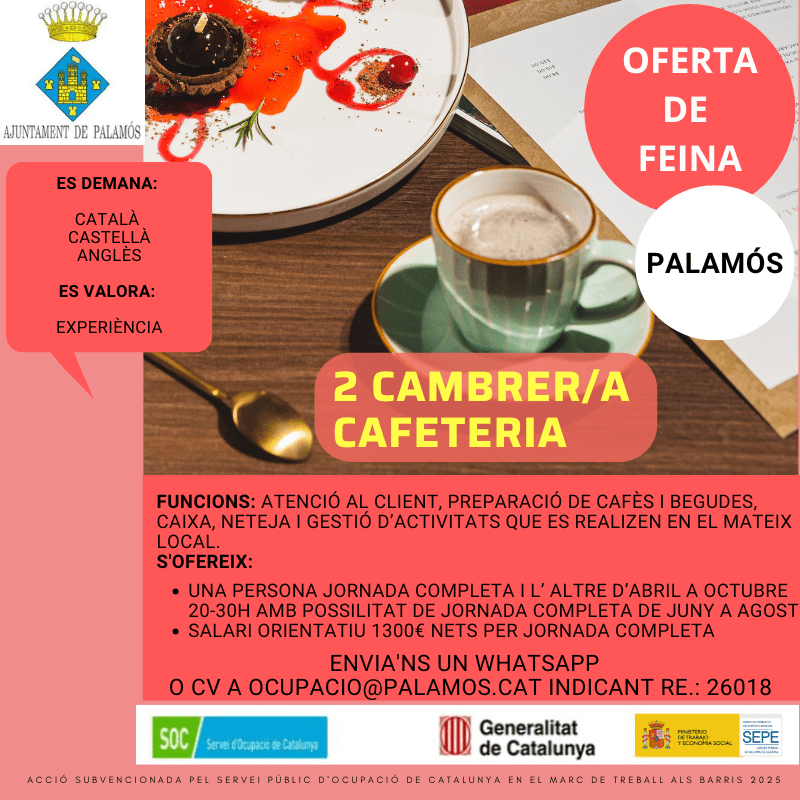 Es cerquen dos cambrers/es per una cafeteria de Palamós.