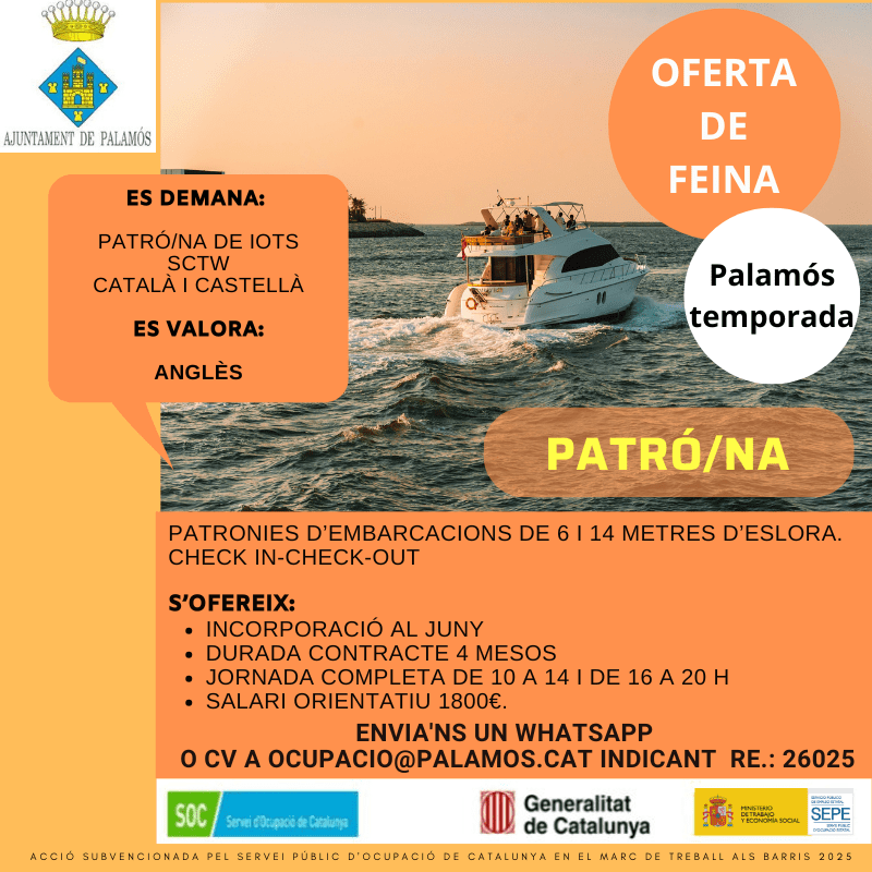 Es cerca patró/na embarcacions amb titulació i SCTW. Inici juny, durada del contracte 4 mesos.